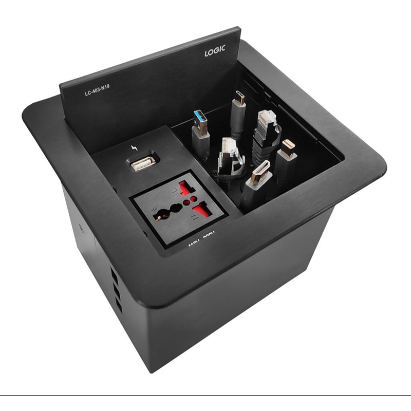 Logic Cable Cubby with Male to Female Cables – Default connectivity : 1xUniversal Power Socket, 1xUSB-A Mobile Charger, 2xHDMI 2.1V, 1xType-A USB 3.1V, 1xType-C USB 3.2V Gen2, 2xCAT 6 Network/RJ-45 ,