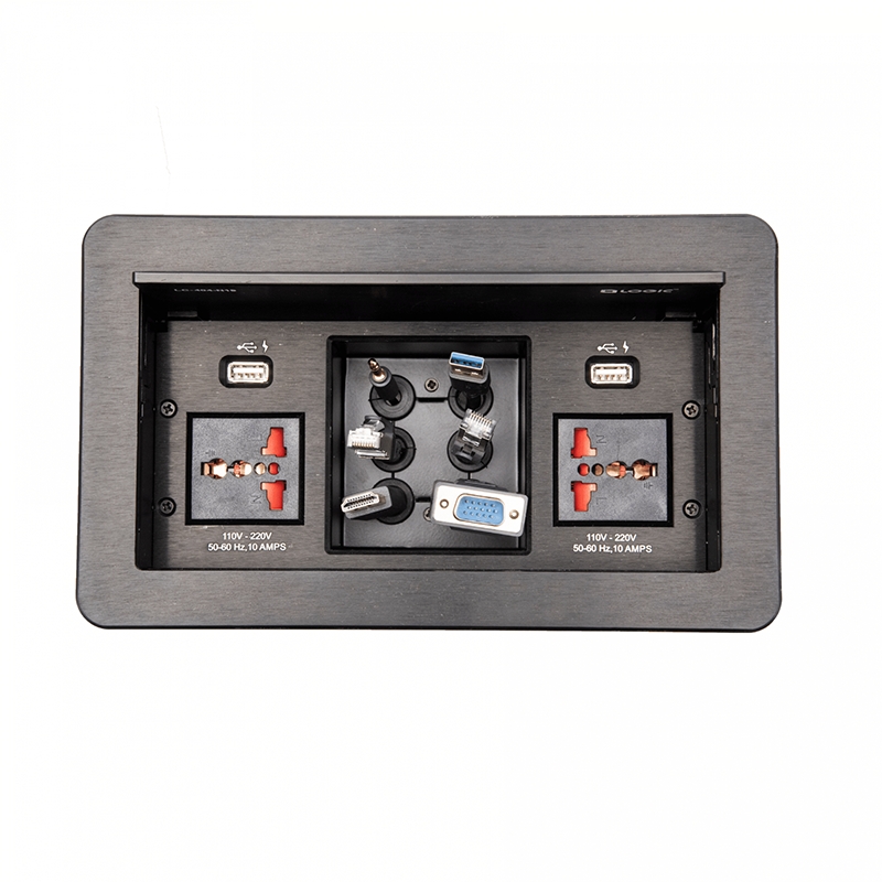 Logic Cable Cubby with Male to Female Cables – Default connectivity : 2xUniversal Power Socket, 1xUSB-A Mobile Charger, 1xUSB-C Mobile Charger, 2xHDMI 2.1V, 1xType-A USB 3.1V, 1xType-C USB 3.2V Gen2, 2 x CAT 6 Network/RJ-45,