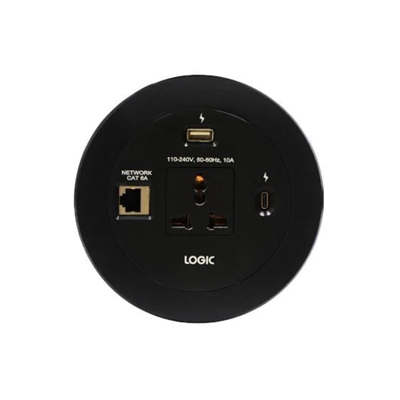 Logic Round Cable Manager – 1xUniversal Power Socket, 1xUSB-A Mobile Charger, 1xUSB-C Mobile Charger, 1xCAT 6A Network/RJ-45