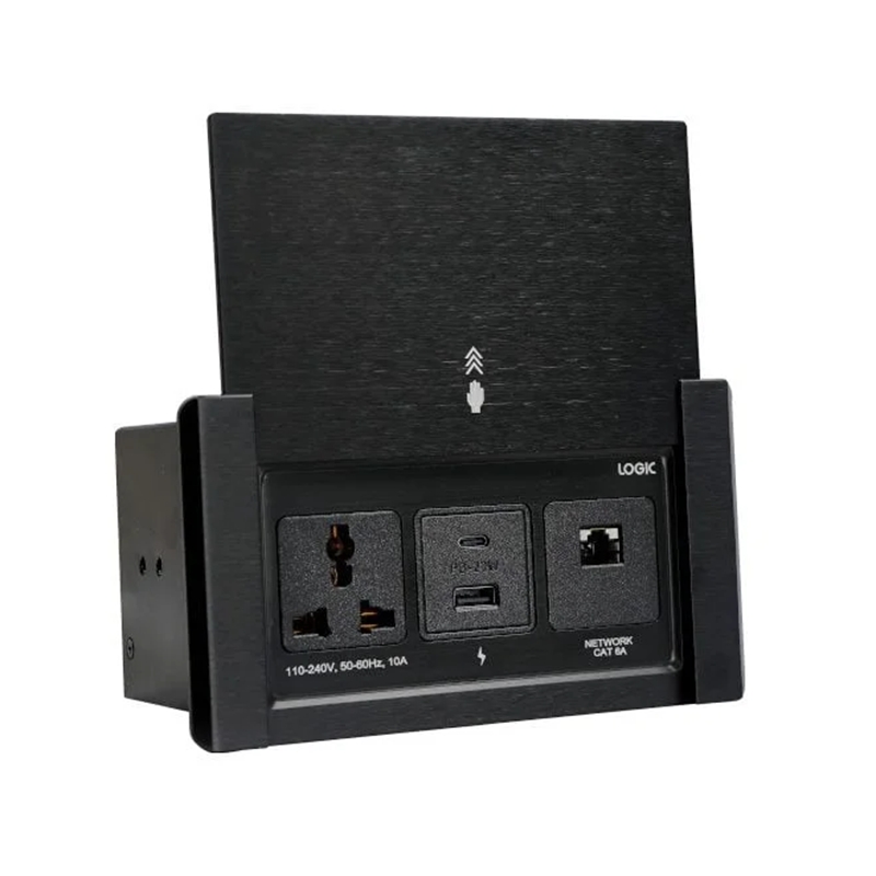 Logic IT Furniture Cable Managers Vertical Sliding Lid Desktop Interface with Female to Female Connectors – 1xUniversal Power Socket, 1xUSB-A+C Mobile Charger, 1xCAT 6A Network/RJ-45
