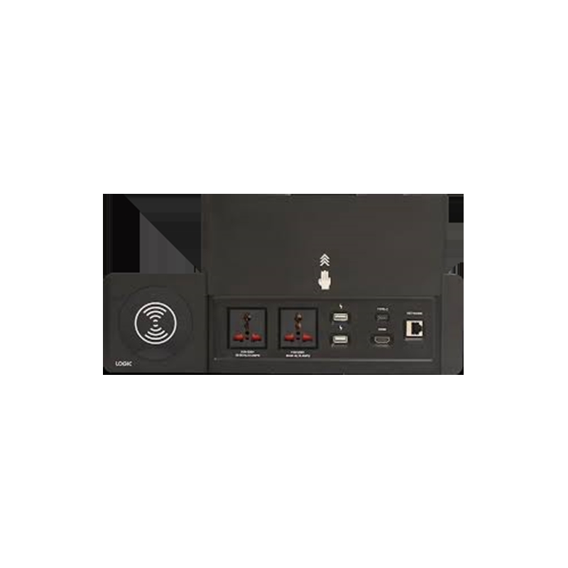 Logic Vertical Sliding Lid Desktop Interface with Female to Female Connectors – 1xMobile Wireless Charger, 2xUniversal Power Socket, 2xUSB-A Mobile Charger, 1xHDMI 2.1V, 1xType-C USB 3.1V, 1xCAT 6A Network/RJ-45